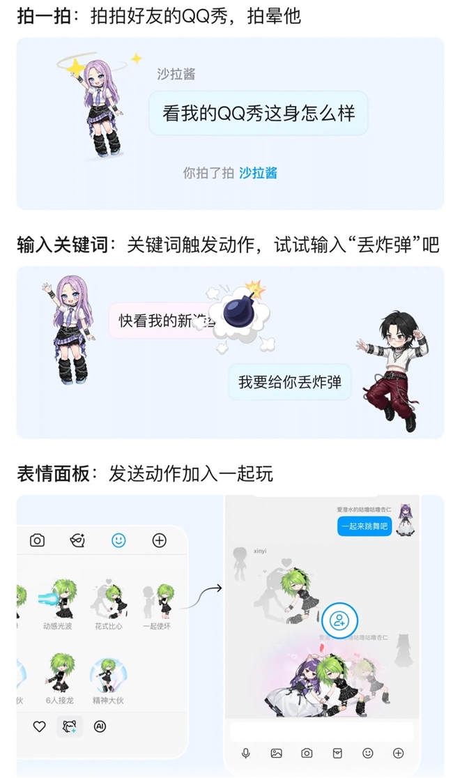 此外,在社交互动层面,QQ秀带来了更生动、更有参与感的玩法体验。过去,用户在聊天里拍一拍好友的头像,只能看到好友设置的趣味文案。现在,QQ秀小人代替头像进入了聊天场景里,拍一拍即可实现小人头晕目眩或原地起跳的效果,这种“破框而出”的生动反馈,让每一次轻互动都更鲜活;输入“哈哈哈”、“爱心”等特定关键词还会触发隐藏彩蛋,小人会根据关键词做出对应动作。